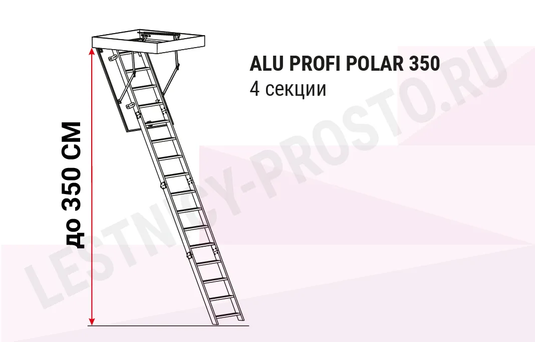 Складная 3-х секционная (до 2800 мм) или 4-х секционная (до 3500 мм) чердачная лестница. Рабочая поверхность полностью выполнена из алюминия. Термоизоляционная крышка типа "сэндвич" имеет усиленную теплозащиту, облицована с двух сторон ДВП белого цвета. По контуру короба имеется уплотнитель;