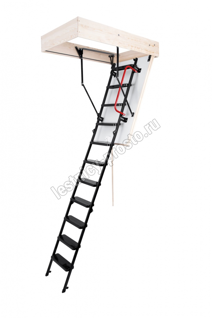 Лестница складная трехсекционная. Рабочая поверхность полностью выполнена из металла и покрашена порошковой краской. Термоизоляционная крышка типа "сэндвич", толщиной 47 мм, утеплена пенопластом, облицована с двух сторон ДCП белого цвета.