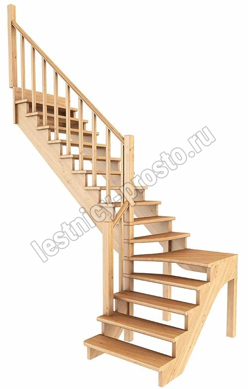 Ступени и поручень лестницы выполнены из дуба, остальные элементы из сосны. Возможно изготовление данной модели полностью из дуба. Базовый комплект включает в себя деревянные элементы лестницы и ограждения без какого-либо покрытия.