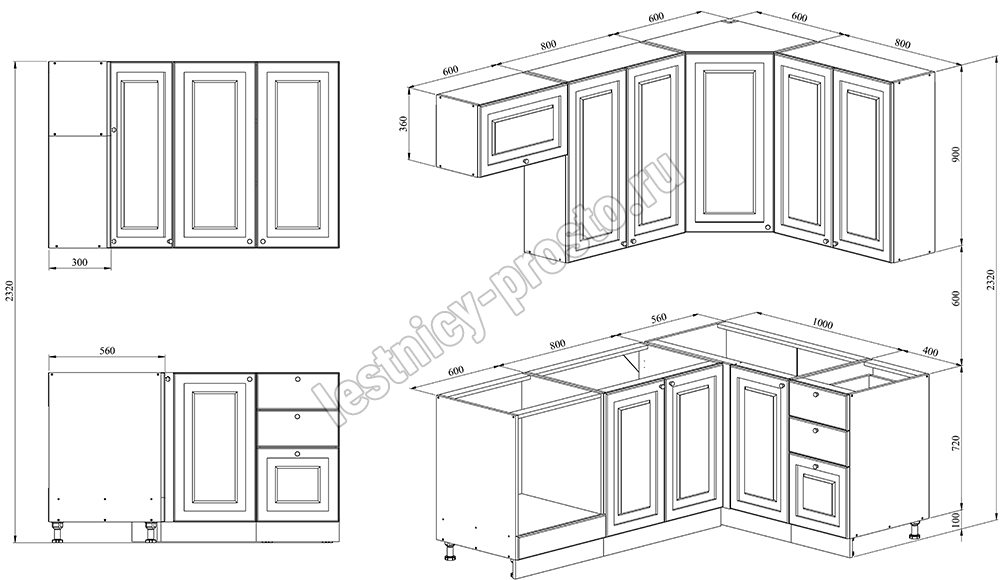 Угловой кухонный гарнитур из 100% массива сосны размером 2 на 1,4 и высотой 2,32 м (в данном проекте использованы высокие верхние ящики 90 см). Благодаря модульной системе такая кухня может быть собрана зеркально, а, например, верхние шкафчики "под стекло" и "глухие" заменены местами. В стандартной комплектации нижние тумбы оснащены регулируемыми ножками высотой 100 мм и цоколем из массива сосны 95 мм.