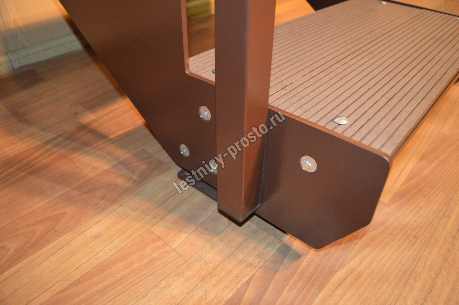 Надежный красивый каркас из толстого стального листа толщиной 8мм с оригинальным дизайном. Покрытие порошковое, очень прочное и долговечное. Все детали каркаса крепятся с помощью болтов, благодаря чему Вы можете собрать каркас самостоятельно без применения сварки. Ступени лестницы состоят из металлической рамки, обеспечивающей необходимую прочность, и покрытия из террасной доски ДПК (древесно-полимерный композит). Ступени не боятся воды и мороза, не теряют со временем свой внешний вид и не требуют ухода. Под заказ, возможно изготовление ступеней из других материалов, таких как: рифленая сталь, лотки под плитку, решетчатый настил, дерево. Базовое ограждение: крашеное или из полированной нержавеющей стали.