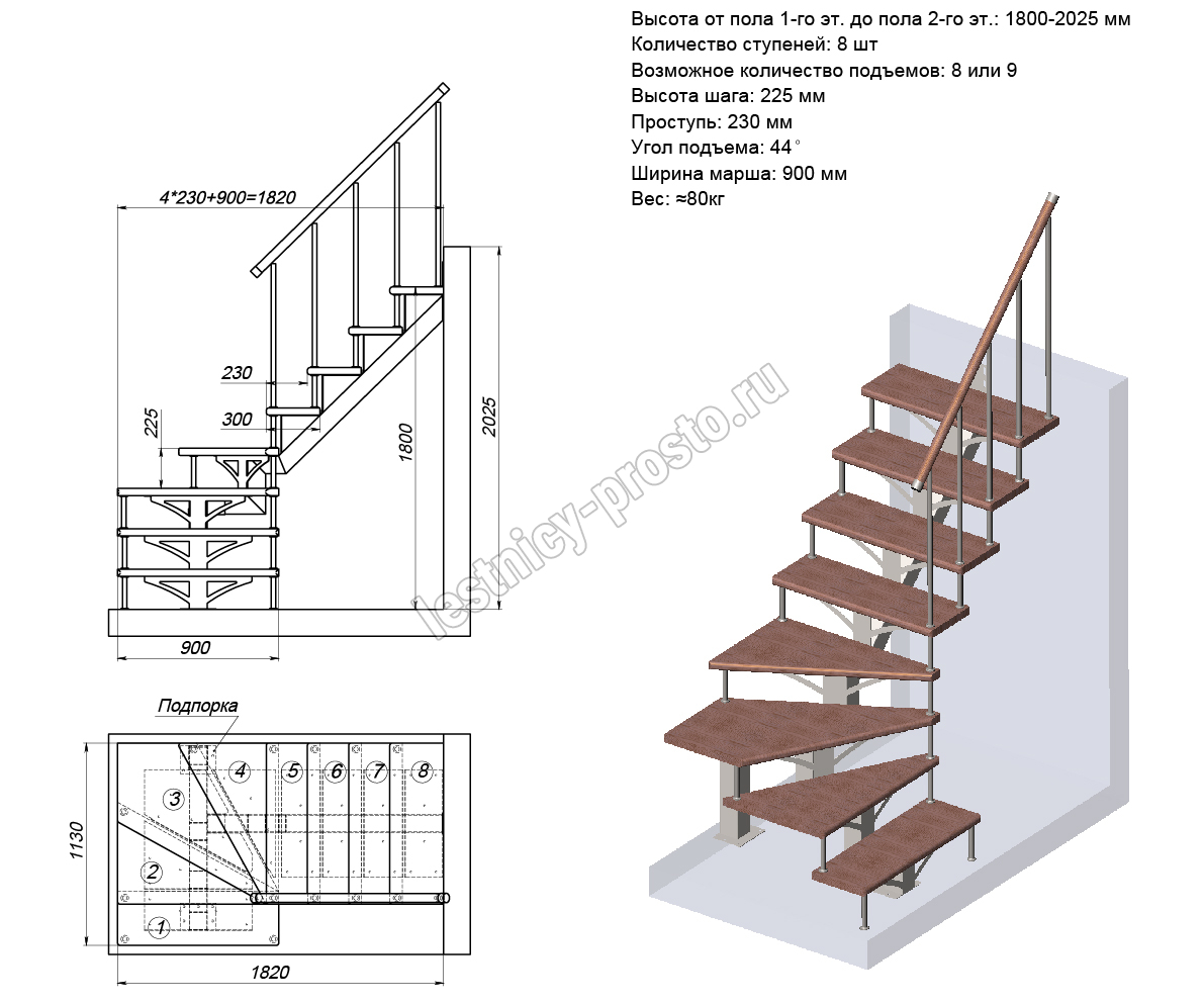 Лестница PROSTO MONO Г-образная h202.5 см, ступени лиственница