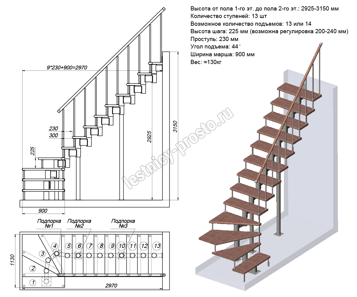 Высота лестницы 2925 - 3150 (13 ступеней) мм