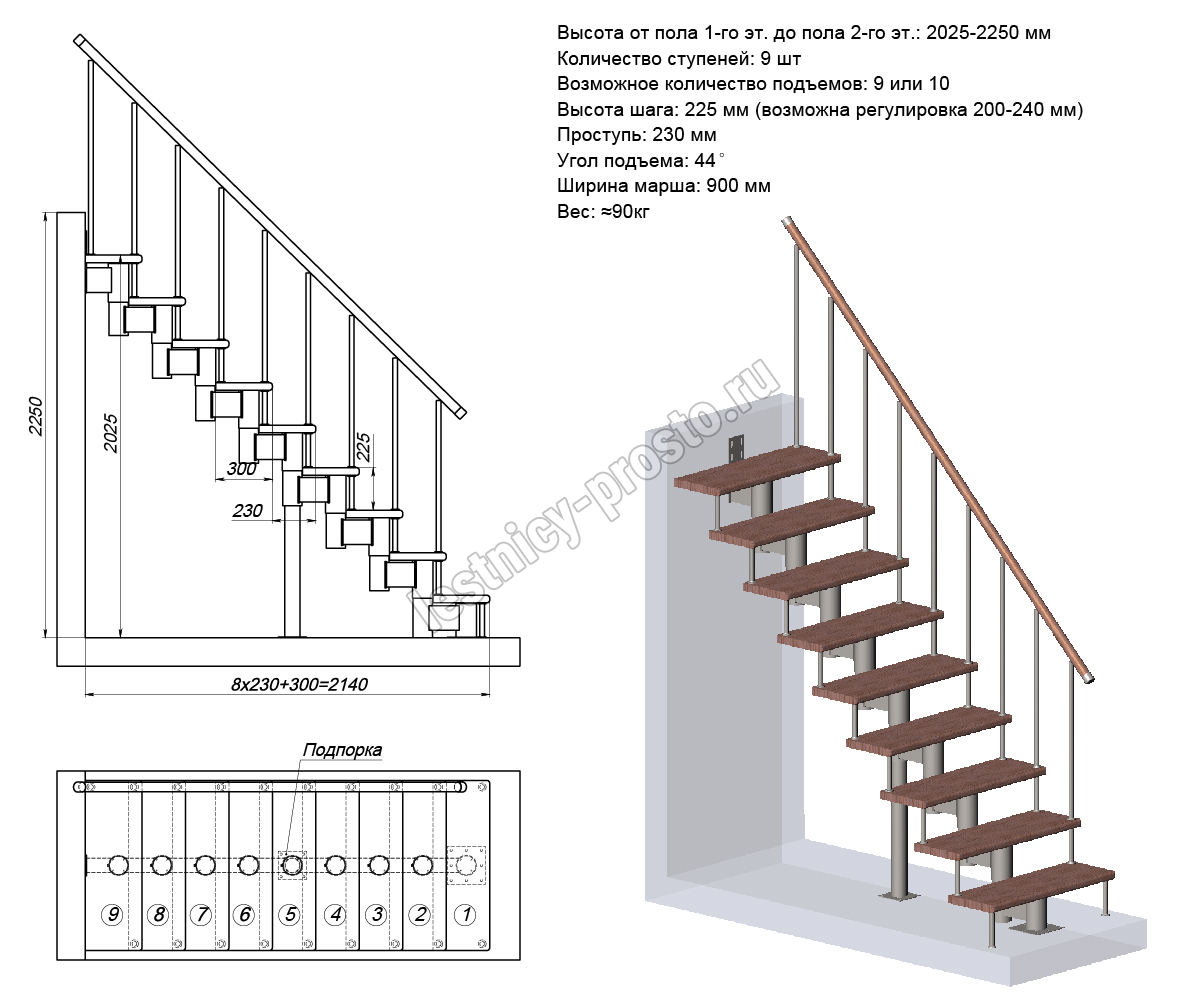 Высота лестницы 2025 - 2250 (9 ступеней) мм