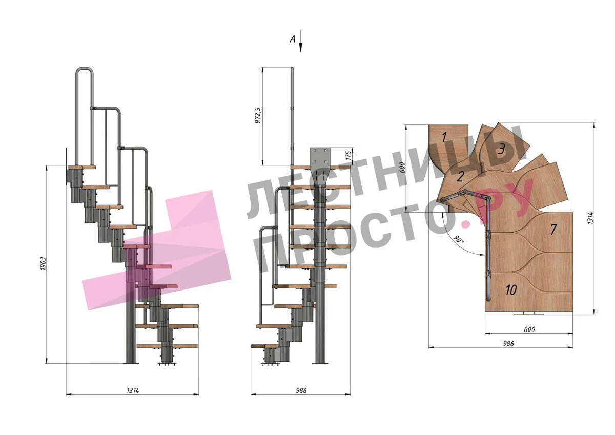 Лестница Prosto Urban White гусиный шаг 600 мм, h180-264 см (10 ступеней), ясень
